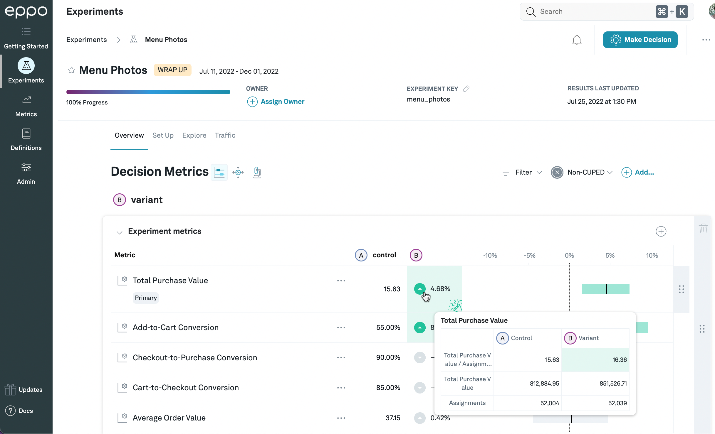 Once you have started to collect data on some experiments, you'll want to start reviewing the results! Eppo allows you to see experiment results across multiple experiments, zoom in on a specific experiment, estimate global impact, and then slice and dice those results by looking at different segments and metric cuts.